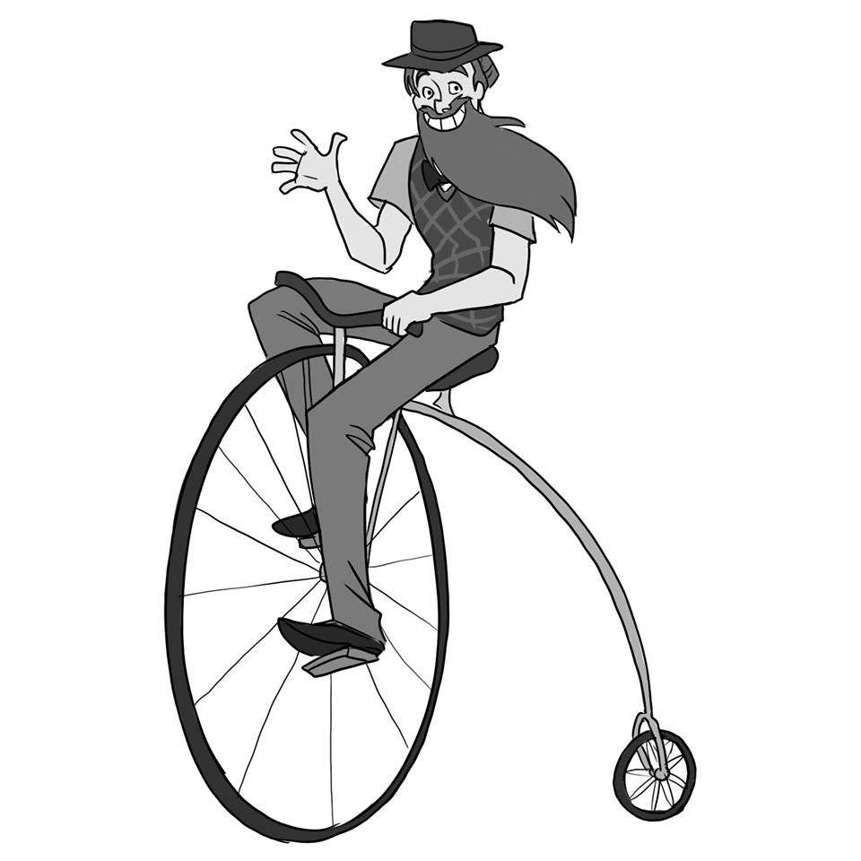 Chad is described as a bearded man who wears a matching brown vest & fedora along with a red bowtie. He rides a penny-farthing bicycle.